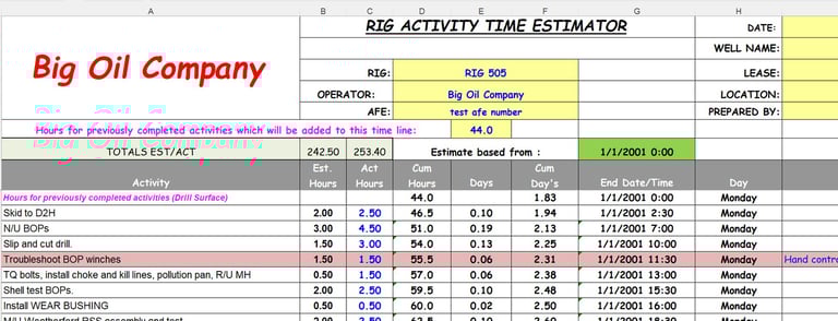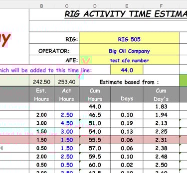 HISTORY: In the late 1990s I was working as a DSM in Pinedale, WY. I disliked doing the "drilling diary" and "to-do lists" in a notebook. So, I took a couple of days and wrote a spreadsheet to estimate drilling times and make notes. I called it "Rig Activity Time Estimator". I improved it over the years and shared it with other DSMs. Many found it useful and likewise shared it.