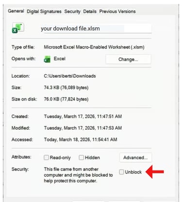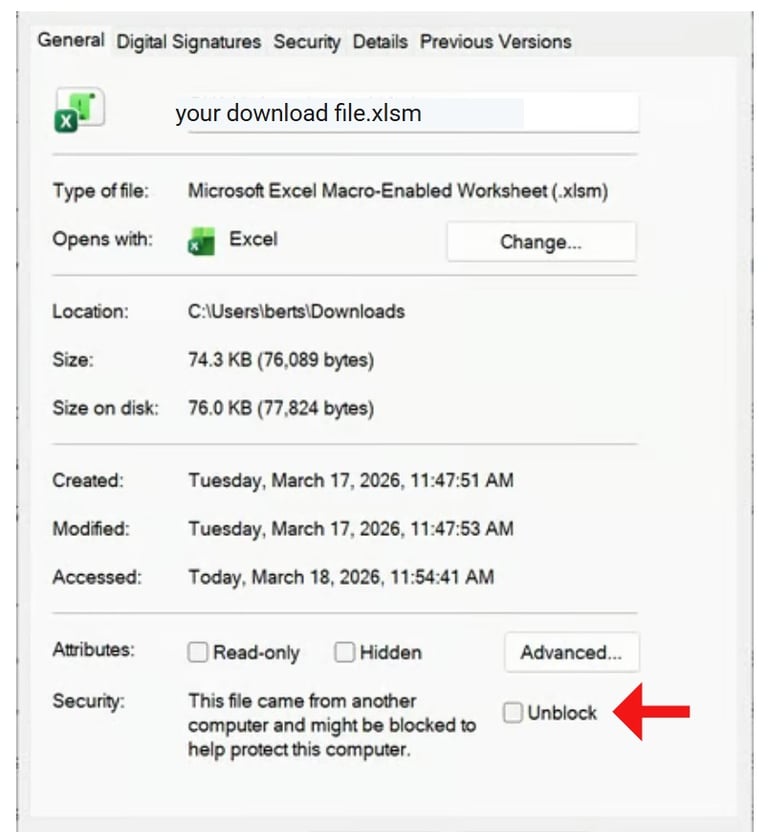 Right Click on the application .xlsm file in the folder and select PROPERTIES from the dropdown.
